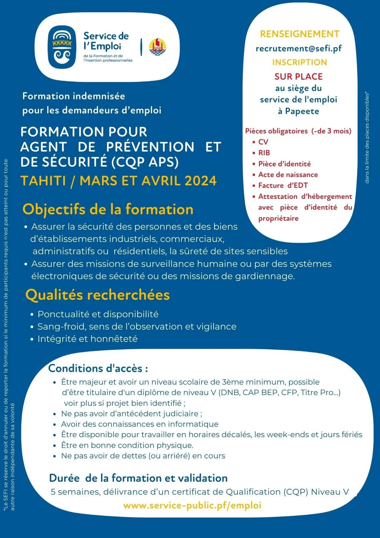 Prends contact avec ton conseiller par mail recrutement@sefi.pf OU directement sur place au Siège du Service de l’Emploi à Papeete !