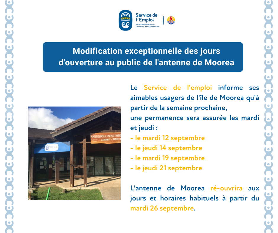 Modification exceptionnelle des jours d'ouverture au public de l'antenne de Moorea A Moorea, le 08 septembre 2023 Heirani Caron8 septembre 2023 Facebook0 Twitter LinkedIn0 Reddit Tumblr Pinterest0 0 Likes