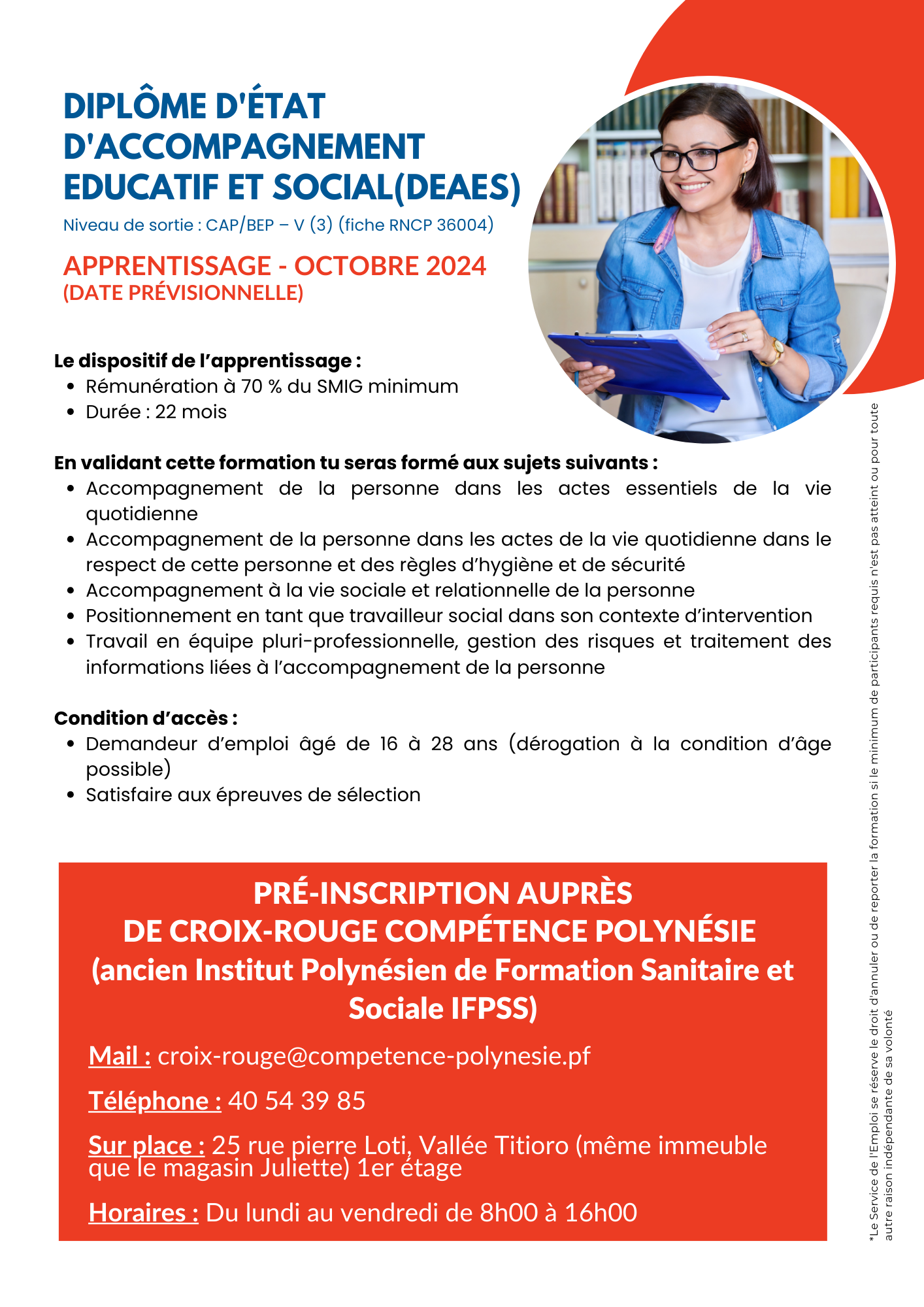 Pour se mettre en relation avec la Croix-Rouge Compétence Polynésie (ancien Institut Polynésien de Formation Sanitaire et Sociale IFPSS), les demandeurs d’emploi doivent adresser leur demande :