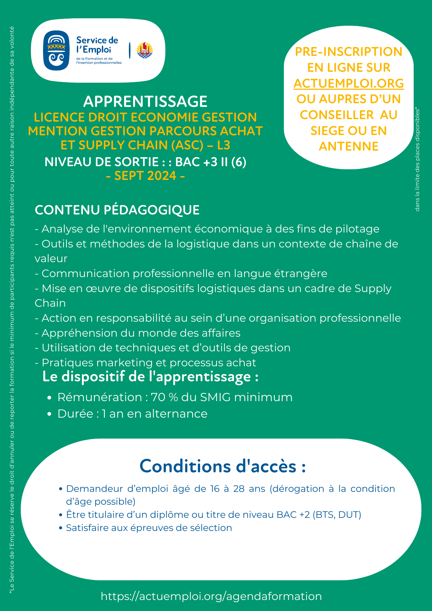 PRE-INSCRIPTION APPRENTISSAGE LICENCE DROIT ECONOMIE GESTION MENTION GESTION PARCOURS ACHAT ET SUPPLY CHAIN (ASC) – L3 lundi 15 avril 2024 10:20 AM 10:20 jeudi 1 août 2024 12:00 PM 12:00 Service de l'Emploi Rue Monseigneur Tepano Jaussen Papeete, Îles du Vent, 98714 Polynésie française (carte) Google Agenda ICS