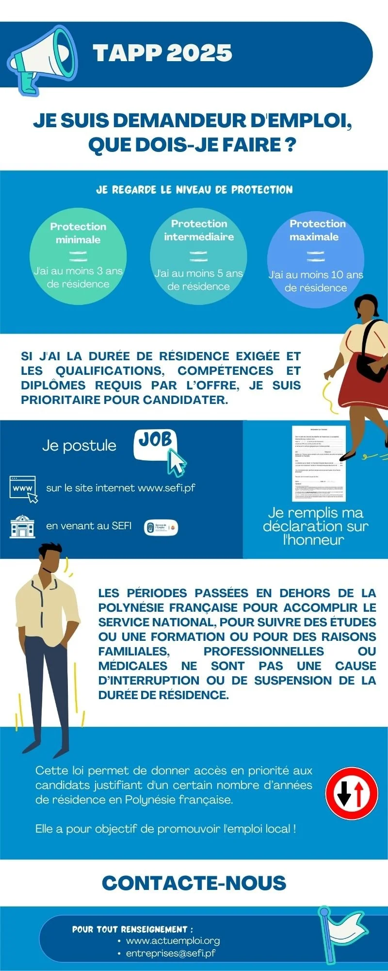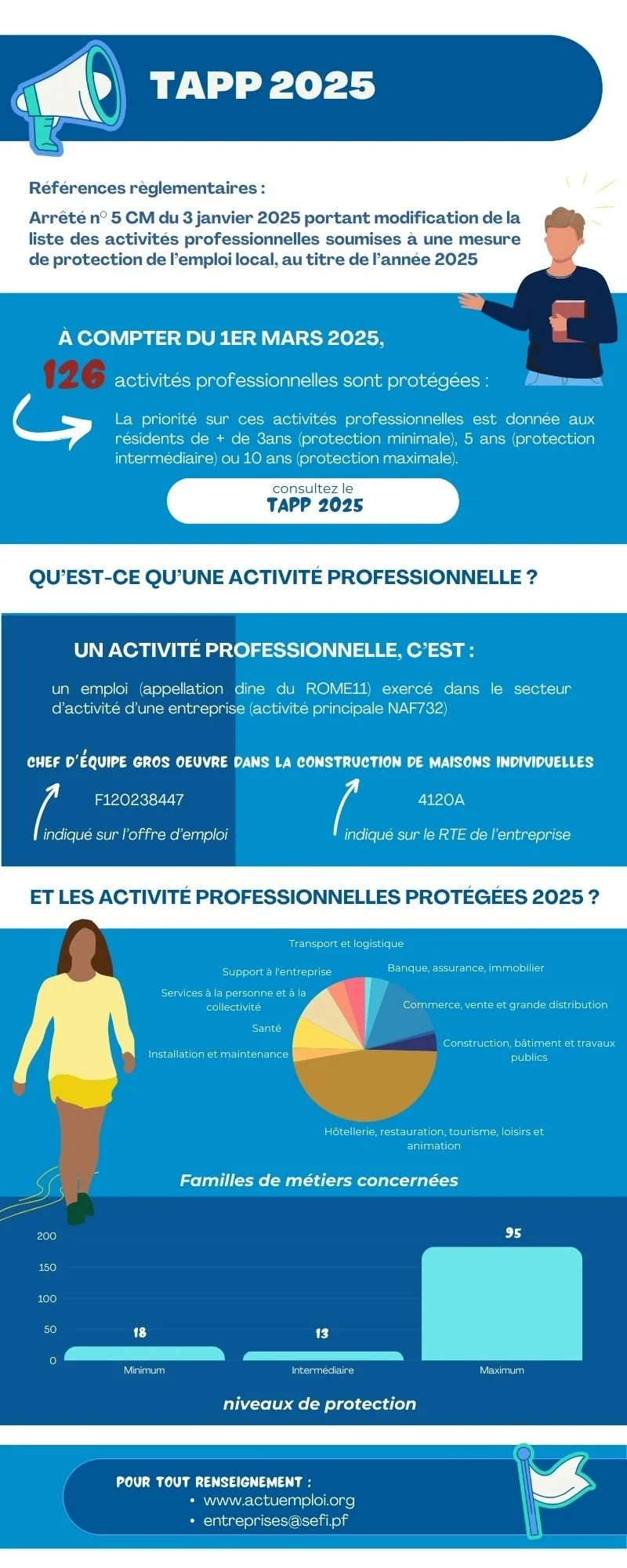A partir de la liste des activités professionnelles protégées et des travaux de l’observatoire de l’emploi sur l’analyse du marché du travail polynésien, le Service de l’Emploi proposera une carte de formations permettant de développer les compétences qui font défaut sur le territoire et qui génèrent des recrutements à l’extérieur.